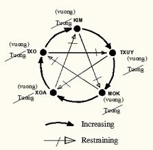 Figure 1.3 shows that Kim increases Txuy and makes Txuy prosperous. Prosperous Txuy increases Mok and makes Mok become prosperous and prosperous, so called Tuong state, i.e much more than prosperous state. It means Mok is in extreme state. Then there Kim to restrain Mok and bring Mok back to prosperous state and Tuong state is resolved. Prosperous Mok increases Xoa so makes Xoa Prosperous Prosperous meaning Tuong, i.e being in extreme state. Xoa meets Txuy and is restrained by Txuy so Xoa does not become extreme, remain in presperous. In turn, Prosperous Xoa increases Txo to make Txo Tuong, i.e extreme, there comes Prosperous Mok to restrain Txo to make Txo not to be extreme, but remain in prosperous state. Then Prosperous Txo increases Kim to make Kim Tuong, i.e., extreme. Kim Tuong will be restrained by Prosperous Xoa so Kim Tuong is resolved and remains in Prosperous. Then Prosperous Kim increases Txuy to make Thuy Tuong, extreme. There comes again Txo to restrain Txuy and make Txuy remain in Prosperous. It’s apparent that the inter-increasing – inter-retraining character of Five Units as illustrated in Figure 1.3 keeps the Five Units always in Prosperous but not in extreme state (i.e. not become Tuong, extreme, which can lead to explosion or destruction). That is the interesting character of the Five Units.